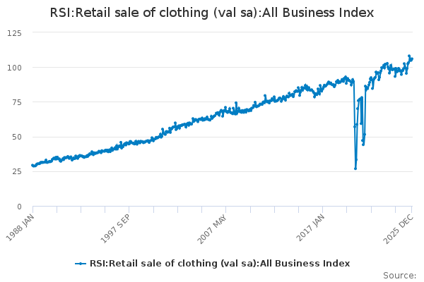 Download this time seriesRSI:Retail sale of clothing (val sa):All Business Index