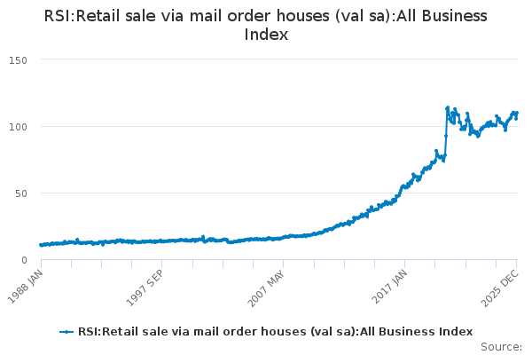 Download this time seriesRSI:Retail sale via mail order houses (val sa):All Business Index