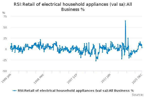 Download this time seriesRSI:Retail of electrical household appliances (val sa):All Business %