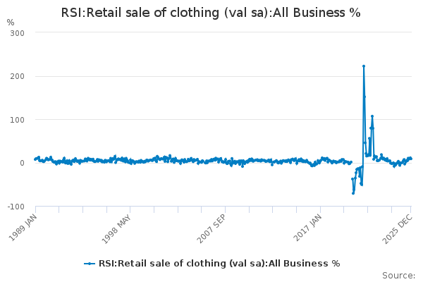 Download this time seriesRSI:Retail sale of clothing (val sa):All Business %