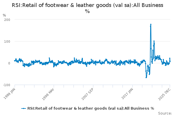 Download this time seriesRSI:Retail of footwear & leather goods (val sa):All Business %