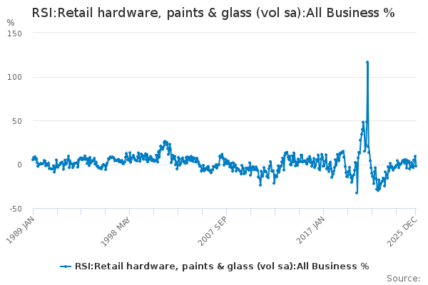Download this time seriesRSI:Retail hardware, paints & glass (vol sa):All Business %