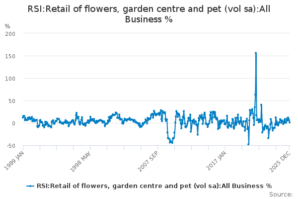 Download this time seriesRSI:Retail of flowers, garden centre and pet (vol sa):All Business %