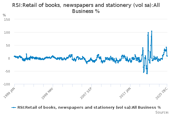 Download this time seriesRSI:Retail of books, newspapers and stationery (vol sa):All Business %