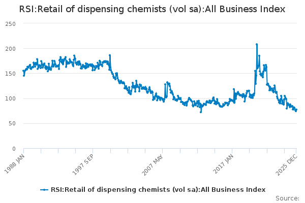 Download this time seriesRSI:Retail of dispensing chemists (vol sa):All Business Index