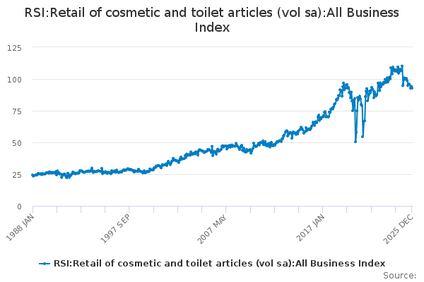 Download this time seriesRSI:Retail of cosmetic and toilet articles (vol sa):All Business Index