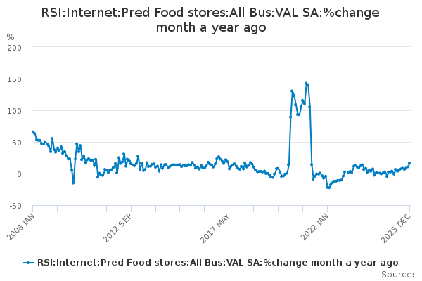 Download this time seriesRSI:Internet:Pred Food stores:All Bus:VAL SA:%change month a year ago