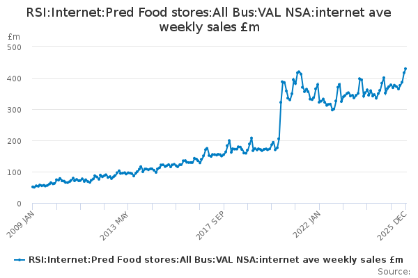 Download this time seriesRSI:Internet:Pred Food stores:All Bus:VAL NSA:internet ave weekly sales £m