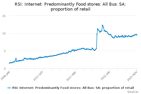 Download this time seriesRSI: Internet: Predominantly Food stores: All Bus: SA: proportion of retail