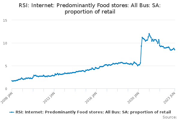 Download this time seriesRSI: Internet: Predominantly Food stores: All Bus: SA: proportion of retail