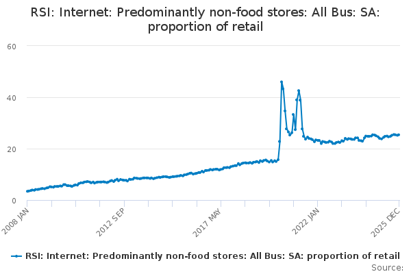 Download this time seriesRSI: Internet: Predominantly non-food stores: All Bus: SA: proportion of retail