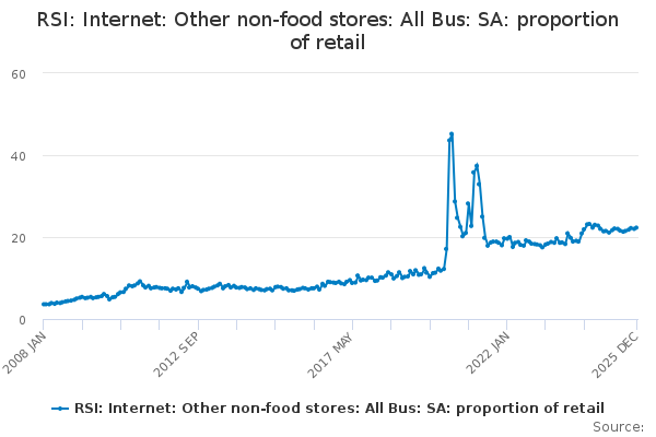 Download this time seriesRSI: Internet: Other non-food stores: All Bus: SA: proportion of retail