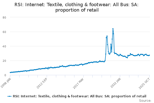 Download this time seriesRSI: Internet: Textile, clothing & footwear: All Bus: SA: proportion of retail
