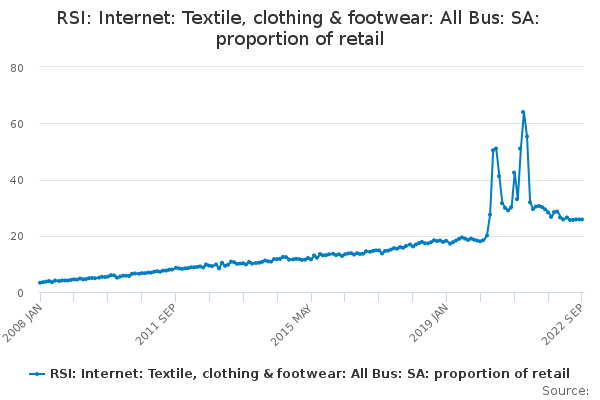 Download this time seriesRSI: Internet: Textile, clothing & footwear: All Bus: SA: proportion of retail