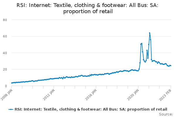 Download this time seriesRSI: Internet: Textile, clothing & footwear: All Bus: SA: proportion of retail