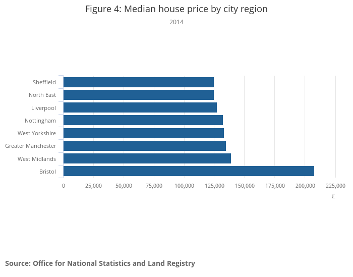 .xls (25.6 kB)Relatively low average incomes in the north and midlands city regions are reflected in relatively low house prices with median house prices1 in 2014 ranging from £125,000 in North East and Sheffield city regions to £139,000 in West Midlands. By contrast, in Bristol city region, median house prices in 2014 were £207,750.
