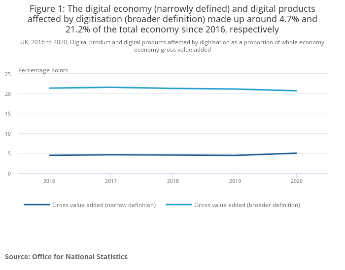 A broader definition of the digital economy (including both digital and digitally affected products), also remained flat over the period 2016 to 2020, but made up a substantially higher portion of whole economy GVA. Figure 1 illustrates the measurement of the wider digital economy ("digitally affected" products). The graph shows a fall between 2019 and 2020 from 21.16% to 20.72%, although the most recent revised estimates remain relatively stable across the measurement period.
