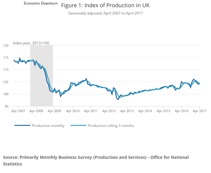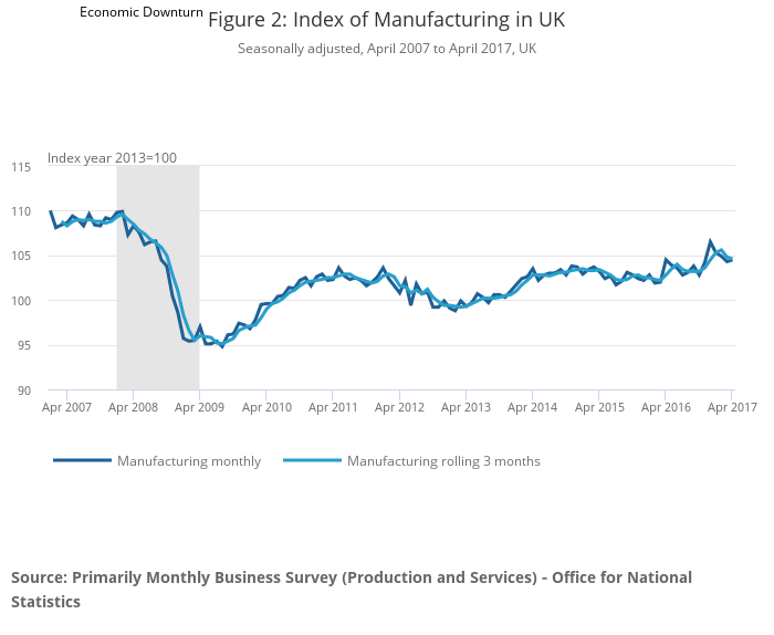 Figures 1 and 2 show that both the Index of Production (IoP) and Index of Manufacturing (IoM) followed a broadly upward trend following the economic downturn. Growth was more pronounced from the beginning of 2010, as the economy recovered, before a slight downturn during 2012. Since then, both production and manufacturing output have risen steadily but remain well below their level reached in the pre-downturn gross domestic product (GDP) peak in Quarter 1 (Jan to Mar) 2008, by 7.9% and 4.1% respectively in the 3 months to April 2017.