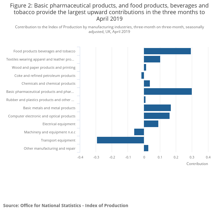 Partially offsetting the increase in overall manufacturing growth was a fall of 6.2% within transport equipment, driven by the significant decline in the monthly index during April 2019, as highlighted in Section 5.