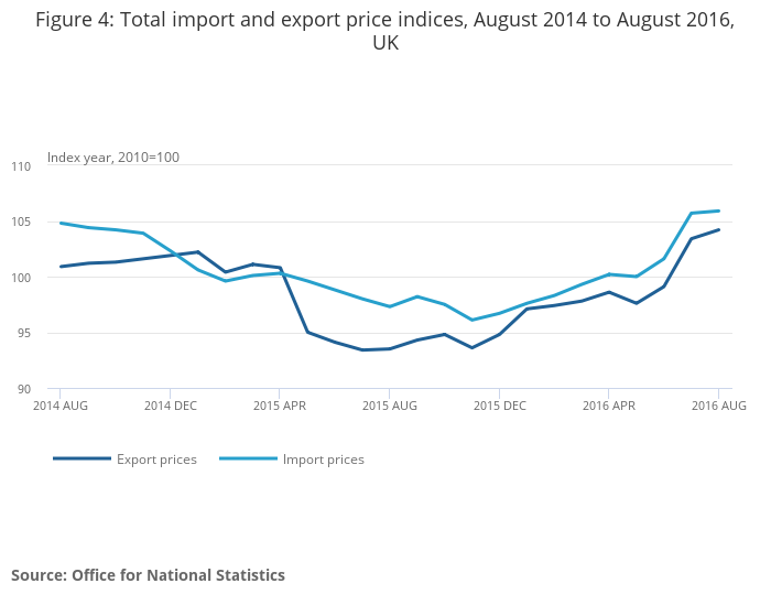 Figure 4: Total import and export price indices, August 2014 to August 2016, UK