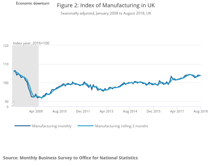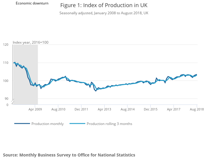 Figures 1 and 2 show that both the Index of Production (IoP) and Index of Manufacturing (IoM) followed a broadly upward trend following the economic downturn. Growth was more pronounced from the beginning of 2010, as the economy recovered, before a downturn during 2012. Production and manufacturing output have risen but remain 5.7% and 1.5% lower, respectively, in the three months to August 2018 than the pre-downturn gross domestic product (GDP) peak in Quarter 1 (Jan to Mar) 2008.