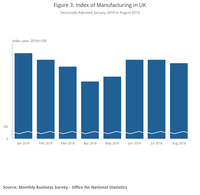 Despite recent signs of a recovery in manufacturing output, following two consecutive periods of three-monthly growth during July and August 2018, recent strength is due, in part, to the three-monthly weakness to May 2018, driven primarily by a weak April 2018, when output fell by 0.8%. This in turn further strengthens the current three-monthly growth, where the index level during June, July and August 2018 remains comparatively flat (Figure 3).