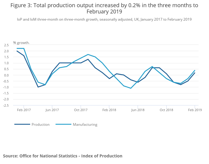 In the three months to February 2019, production output decreased by 0.2% compared with the same three months to February 2018; driven by falls of 0.6% from manufacturing and 3.2% from electricity and gas.