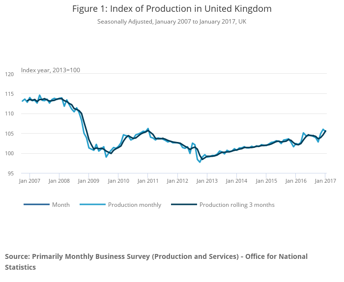 In the 3 months to January 2017, total production was estimated to have increased by 1.9%, with manufacturing providing the largest contribution increasing by 2.1%, its strongest growth since May 2010.