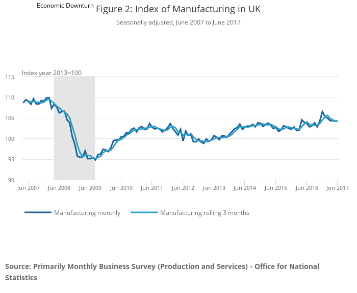 Figures 1 and 2 show that both the Index of Production (IoP) and Index of Manufacturing (IoM) followed a broadly upward trend following the economic downturn. Growth was more pronounced from the beginning of 2010, as the economy recovered, before a downturn during 2012. Since then, both production and manufacturing output have risen but remain well below their level reached in the pre-downturn gross domestic product (GDP) peak in Quarter 1 (January to March) 2008, by 7.8% and 4.4% respectively in the 3 months to June 2017.