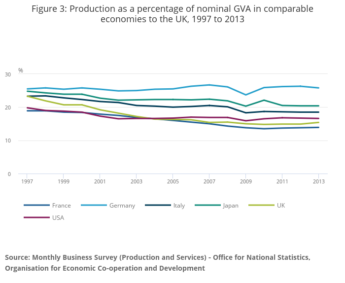 .png (42.1 kB) .xls (24.6 kB)Figure 3 shows the share of nominal gross value added (GVA) accounted for by production in the UK and a selection of other major economies (more information on data for France, Germany, Italy, Japan and the USA can be found on the Organisation for Economic Co-operation and Development (OECD) website). In 1997, the share of nominal GVA accounted for by production in the UK was 23.3%, around the middle of the range relative to the other economies. By 2013, the UK had become relatively less reliant on production, as its share fell to 15.4% of nominal GVA. The same trend was observed in manufacturing, where the share of nominal GVA fell from 18.4% in 1997 to 10.8% in 2013. Moreover, between 1997 and 2013 the composition of production in the UK changed slightly with the share of production attributed to manufacturing decreasing from 78.8% in 1997 to 69.8% in 2013.