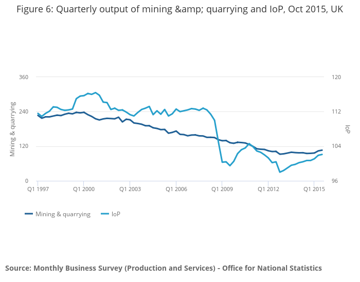 Figure 6: Quarterly output of mining & quarrying and IoP, Oct 2015, UK