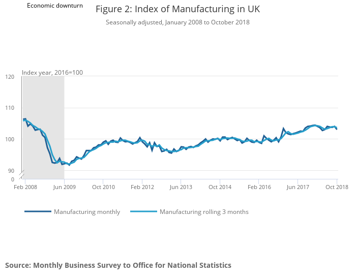 Figures 1 and 2 show that both the Index of Production (IoP) and Index of Manufacturing (IoM) followed a broadly upward trend following the economic downturn. Growth was more pronounced from the beginning of 2010, as the economy recovered, before a downturn during 2012. Production and manufacturing output have risen but remain 5.9% and 1.9% lower, respectively, in the three months to October 2018 than the pre-downturn gross domestic product (GDP) peak in Quarter 1 (Jan to Mar) 2008.