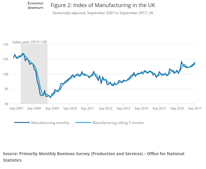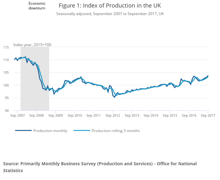 Figures 1 and 2 show that both the Index of Production (IoP) and Index of Manufacturing (IoM) followed a broadly upward trend following the economic downturn. Growth was more pronounced from the beginning of 2010, as the economy recovered, before a downturn during 2012. Since then, both production and manufacturing output have risen but remain below their level reached in the pre-downturn gross domestic product (GDP) peak in Quarter 1 (Jan to Mar) 2008, by 6.4% and 2.5% respectively in the three months to September 2017.