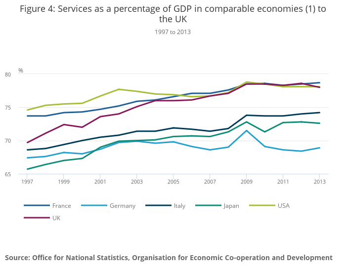 Image .csv .xlsFigure 4 shows the share of gross value added accounted for by services in the UK and a selection of other major economies (more information on data for France, Germany, Italy, Japan and the USA can be found on the Organisation for Economic Co-operation and Development (OECD) website). In 1997 the share of gross value added (GVA) accounted for by services in the UK was just under 70% of nominal GVA, around the middle of the range relative to the other economies shown. By 2013, the UK had become relatively more reliant on services, as its share rose to almost 80% of nominal GVA.
