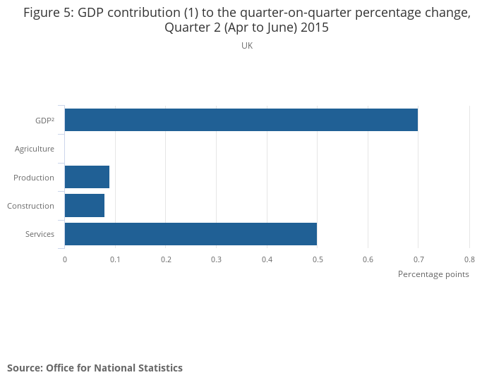 In Quarter 2 (Apr to June) 2015, GDP was estimated to have increased by 0.7% compared with the previous quarter. The contribution an industry grouping makes to the GDP quarterly growth is dependent on the quarterly change in that industry grouping and its weight within the output approach to measuring GDP.