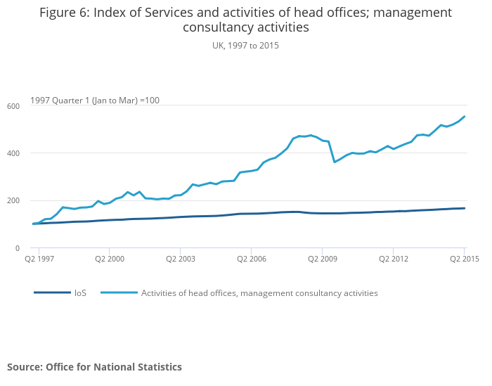 Industry 70 is divided into 2 divisions: activities of head office (division 70.1) and management consultancy activities (division 70.2) which accounts for the majority of turnover for the industry (91.7%) (Annual Business Survey). In 2013, this industry generated £54.5 billion of turnover, which represented 23.9% of the turnover of the professional, scientific and technical activities section (section M) (Annual Business Survey). Moreover, the share of total output attributed to industry 70 increased from 0.4% in 1997 to 1.2% in 2013, signalling a strong growth rate relative to the rest of the economy (Quarterly National Accounts, Quarter 2 (Apr to June) 2015).