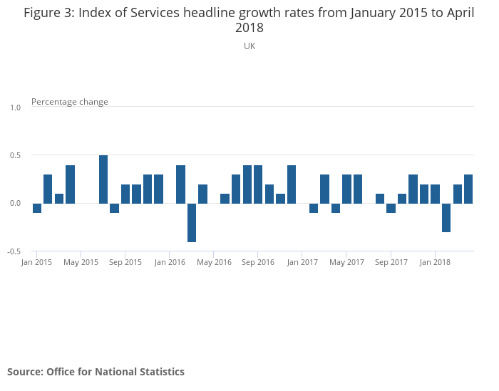 The Index of Services increased by 0.3% between March 2018 and April 2018; this is the highest month-on-month growth since November 2017.