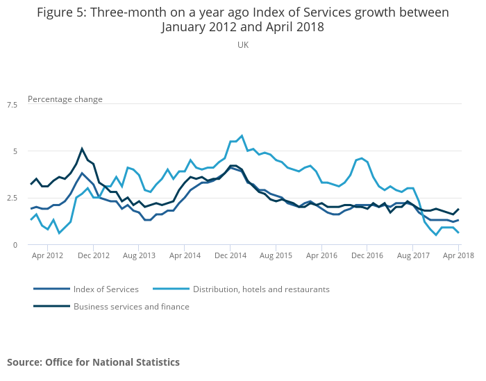In the three months to April 2018, services output increased by 0.2% compared with the three months ending January 2018; this is the lowest rate of growth since the three months to November 2017.