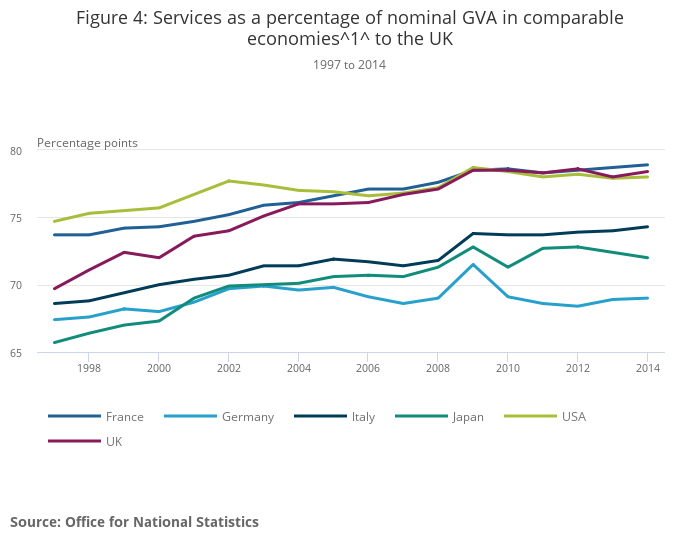 Image .csv .xlsFigure 4 shows the share of nominal (unadjusted for the effect of price changes) gross value added accounted for by services in the UK and a selection of other major economies (more information on data for France, Germany, Italy, Japan and the USA can be found on the Organisation for Economic Co-operation and Development (OECD) website). In 1997, the share of nominal gross value added (GVA) accounted for by services in the UK was just under 70%, around the middle of the range relative to the other economies shown. By 2014, the UK had become relatively more reliant on services, as its share rose to over 78% of nominal GVA.