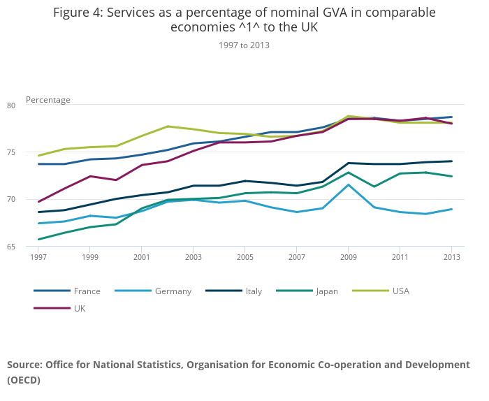 Image .csv .xlsFigure 4 shows the share of nominal (unadjusted for the effect of price changes) gross value added accounted for by services in the UK and a selection of other major economies (more information on data for France, Germany, Italy, Japan and the USA can be found on the Organisation for Economic Co-operation and Development (OECD) website). In 1997, the share of nominal gross value added (GVA) accounted for by services in the UK was just under 70%, around the middle of the range relative to the other economies shown. By 2013, the UK had become relatively more reliant on services, as its share rose to 78% of nominal GVA.