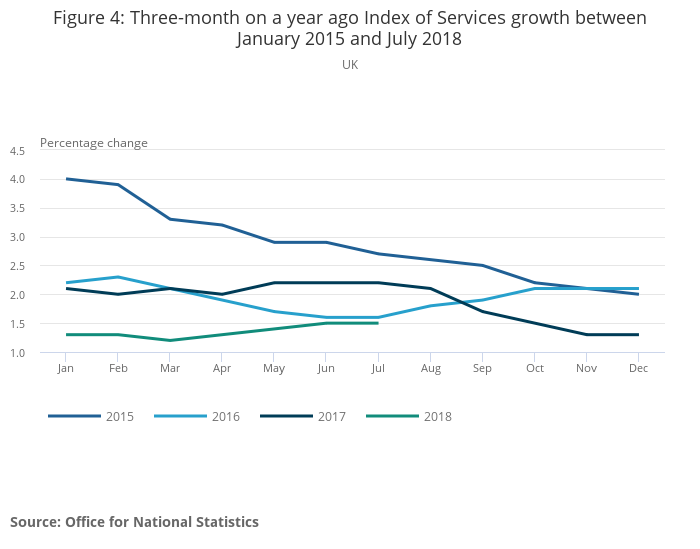 Download this chart Figure 4: Three-month on a year ago Index of Services growth between January 2015 and July 2018