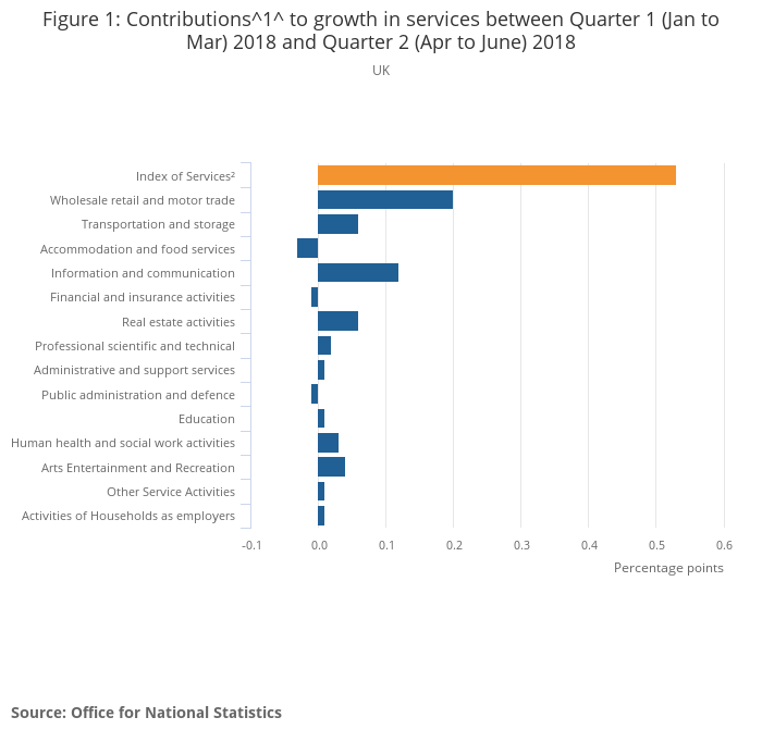 Download this chart Figure 1: Contributions^1^ to growth in services between Quarter 1 (Jan to Mar) 2018 and Quarter 2 (Apr to June) 2018
