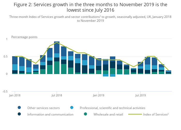 The monthly Index of Services (IoS) provides a timely indicator of growth in the output of the services industries. It is the largest contributor to the output approach in the measurement of gross domestic product (GDP), accounting for 79.6% of UK GDP in 2016. Also published on 13 January 2020 is the GDP monthly estimate, UK: November 2019.