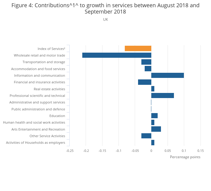 Retail trade decreased by 0.7%, contributing negative 0.05 percentage points. A slowdown in food sales in September 2018, following a good summer was behind this fall. For more information, please see Retail sales, Great Britain: September 2018. This industry along with motor trades was responsible for the decrease in the wholesale, retail and motor trade sector.