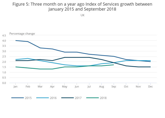 Download this chart Figure 5: Three month on a year ago Index of Services growth between January 2015 and September 2018