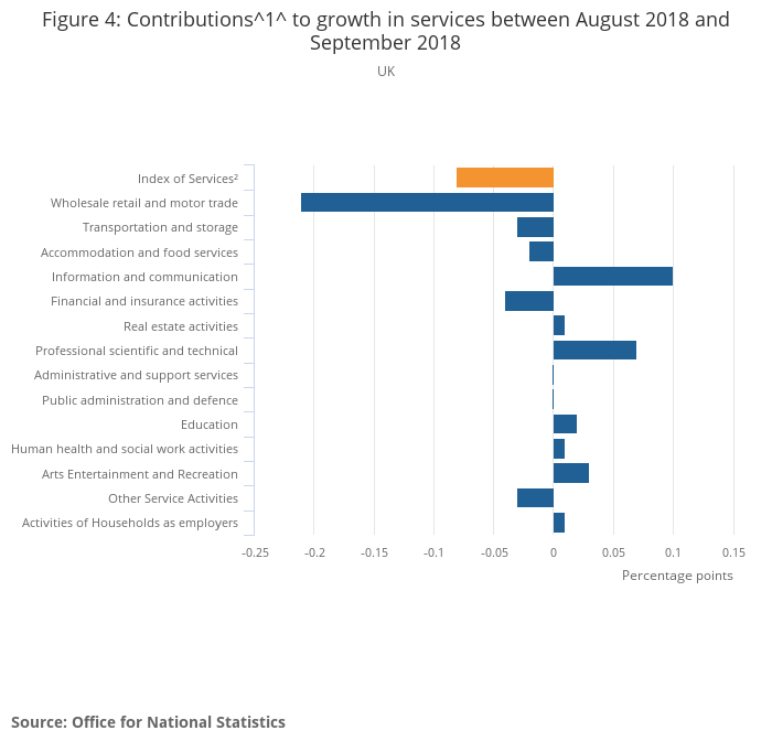 Services output fell by 0.1% in September 2018, following no growth to one decimal place in August 2018.