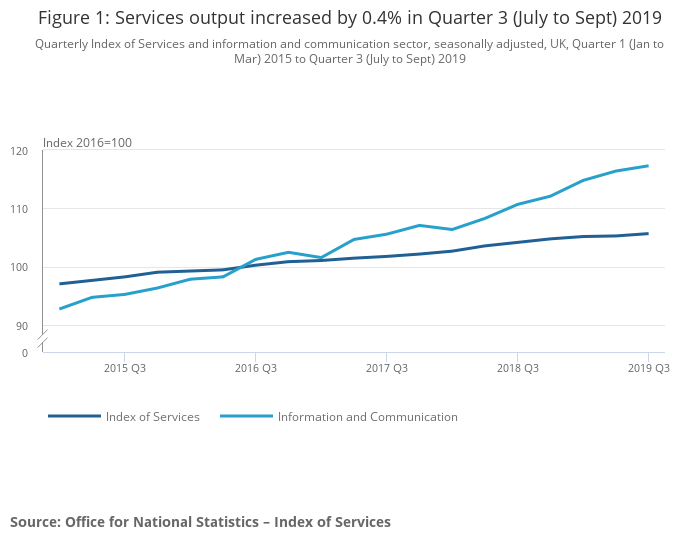 Services output increased by 0.4% in Quarter 3 (July to Sept) 2019 compared with Quarter 2 (Apr to June) 2019.