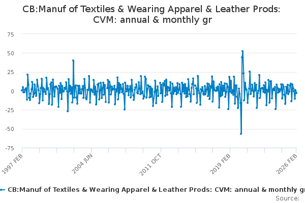 Download this time seriesCB:Manuf of Textiles & Wearing Apparel & Leather Prods: CVM: annual & monthly gr