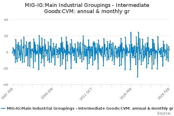 Download this time seriesMIG-IG:Main Industrial Groupings - Intermediate Goods:CVM: annual & monthly gr