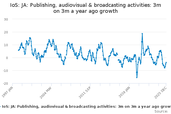 Download this time seriesIoS: JA: Publishing, audiovisual & broadcasting activities: 3m on 3m a year ago growth